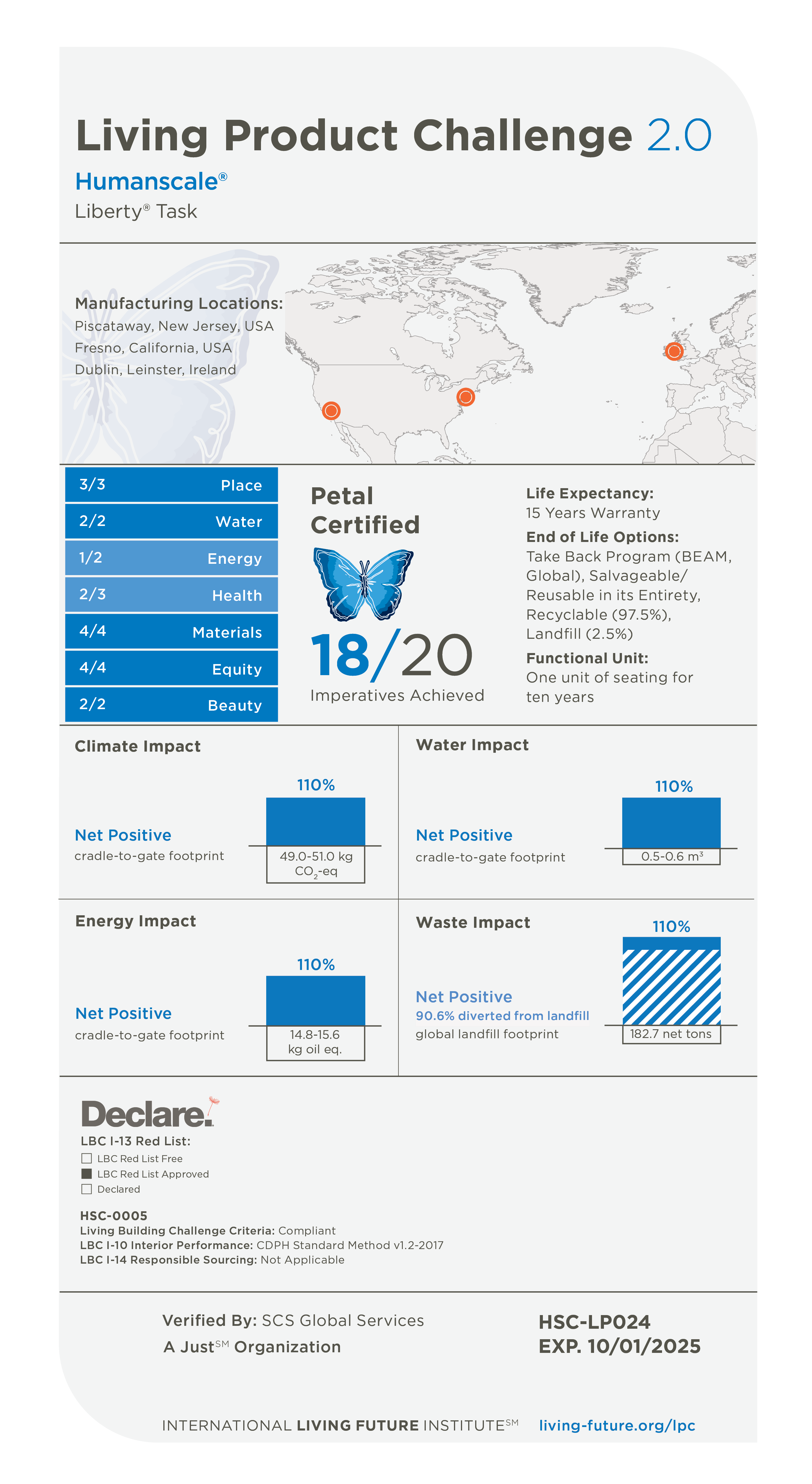 Meeting stringent sustainable manufacturing criteria, Liberty Task is Living Product Certified. This means that Liberty Task is climate, water and energy positive. Every time we make these products the planet is better off. With a mission to create a healthier world, we are proud that over 60% of our products are certified net positive.