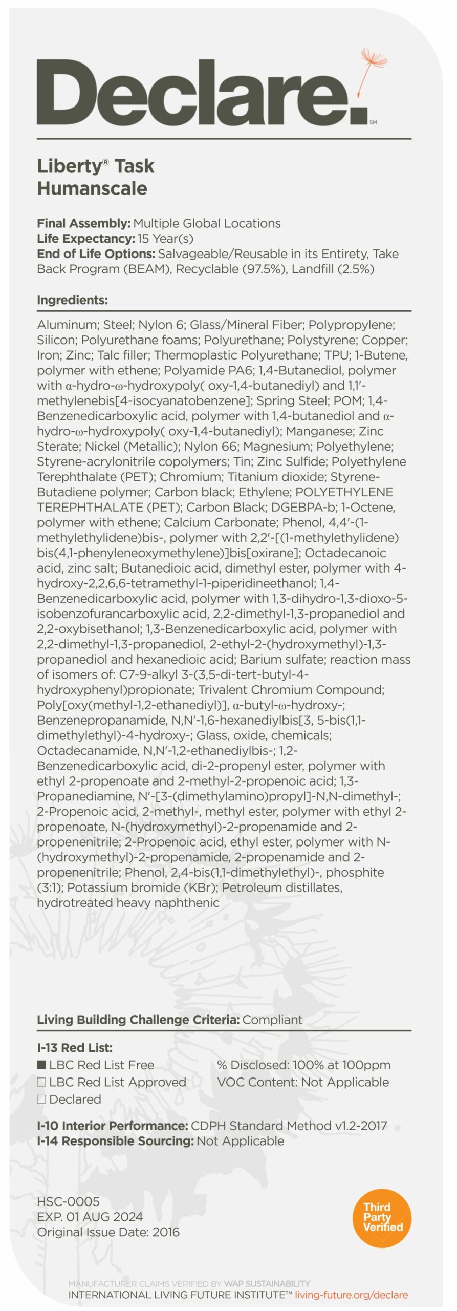 Declare is a nutrition label for building products. It is designed to help specifiers quickly identify products that meet their project requirements. Declare screens a product’s ingredients directly against the Living Building Challenge (LBC) Red List, saving project teams from the arduous task of vetting products by hand. Declare label also demonstrates alignment with other requirements within the Living Building Challenge and Core Green Building Certification, as well as LEED and WELL certifications.
